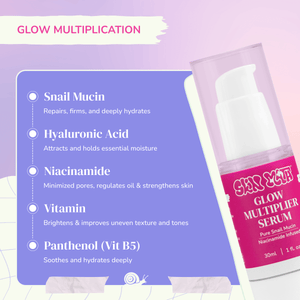 Follow with Glow Multiplier Serum (30 ml | 1 fl. oz.), a deeply hydrating, skin-brightening formula enriched with Pure Snail Mucin, Niacinamide, Vitamin C, and B5, it targets dullness, uneven tone, and dehydration while making your skin feel plump, soft, and visibly radiant.